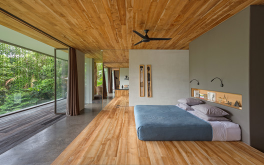 در اتاق خواب ها در کنار بتن و سطوح ساده دیوارها، بخش وسیعی از کف و سقف اتاق خواب ها با چوب پوشانده شده است.